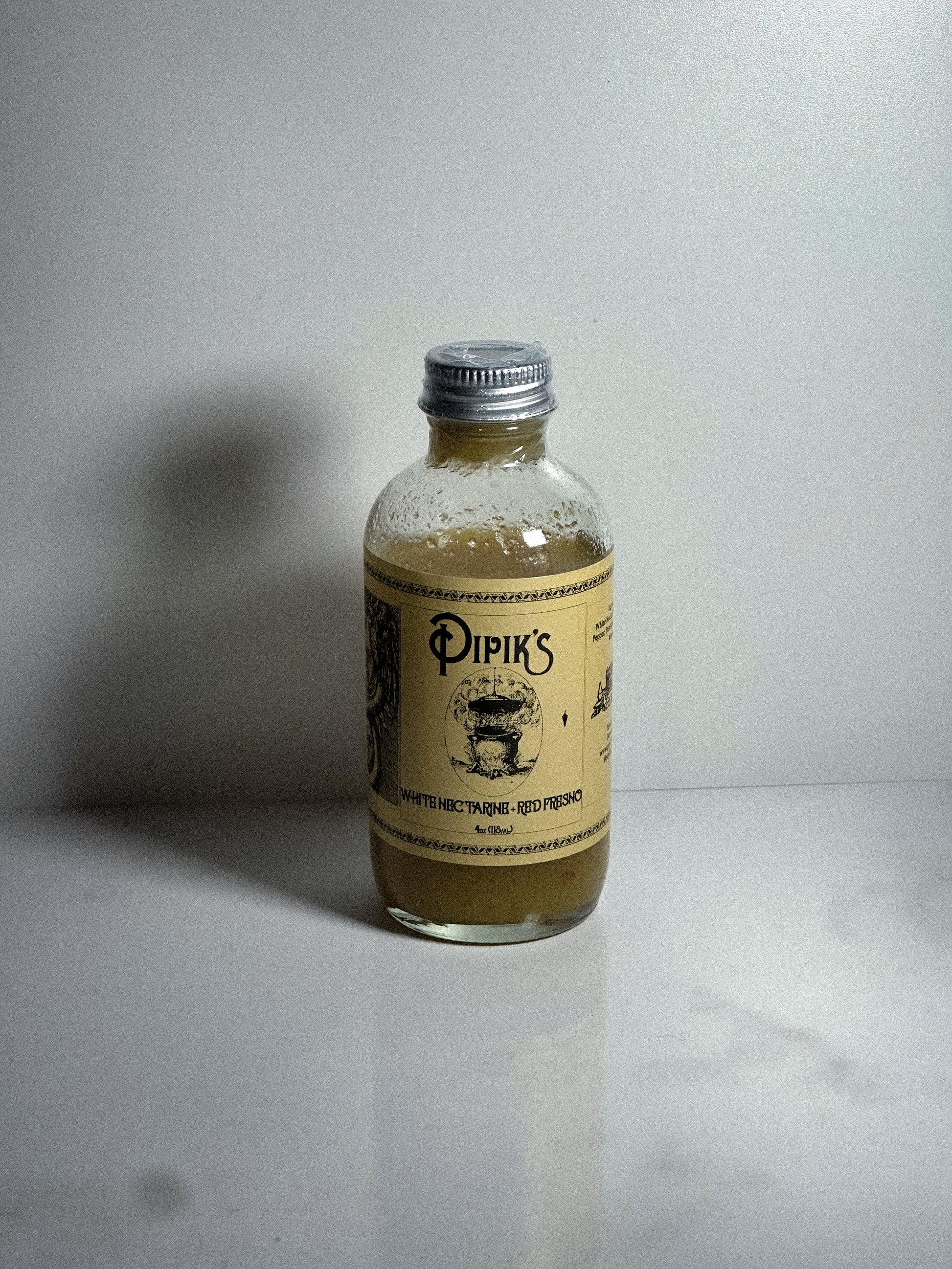 Hot sauce comprised of succulent white nectarines and vibrant red fresno peppers.